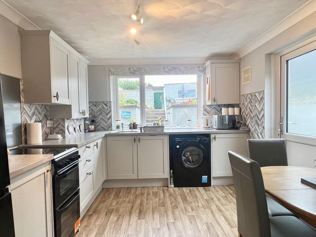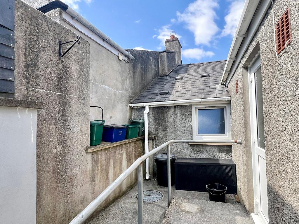 To the rear of the property is a low-maintenance garden, designed with ease of upkeep in mind. The space includes a paved patio and a decked seating area – ideal for enjoying the outdoors with minimal effort. Beyond the garden is access to a private parking bay, along with a useful outbuilding providing additional storage.