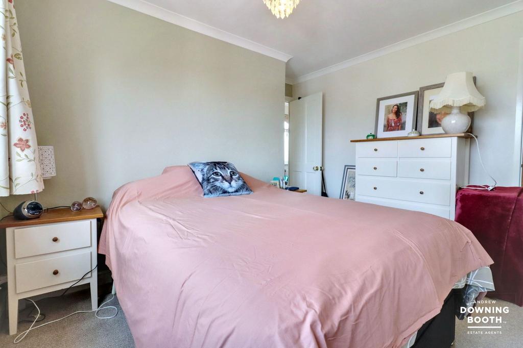 The second double bedroom features a rear-facing UPVC double-glazed window, built-in wardrobe, radiator, and ceiling coving. The room also benefits from access to the loft hatch.