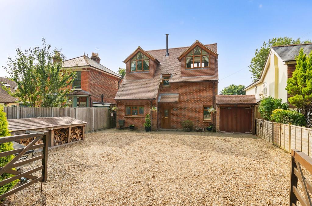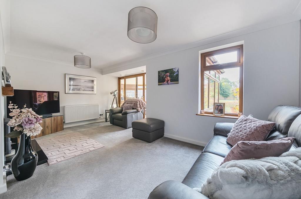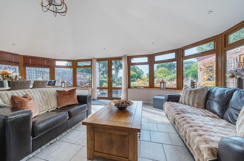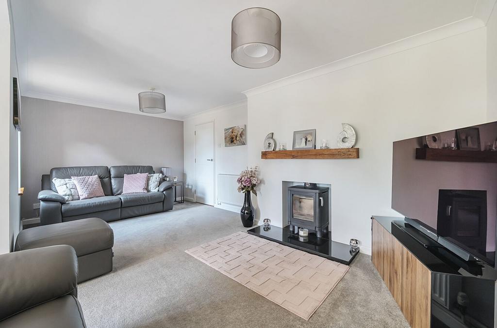 Inside, the house has been thoughtfully designed to make the most of the light and outlook. The welcoming entrance hall leads to a bright sitting room with a wood-burning stove, the perfect place to gather on cooler evenings. Sliding doors open into a large sun room that works beautifully as a dining and entertaining space, with French doors flowing directly out to the garden. The classic shaker-style kitchen is both practical and inviting, offering plenty of storage alongside space for family breakfasts and casual meals.