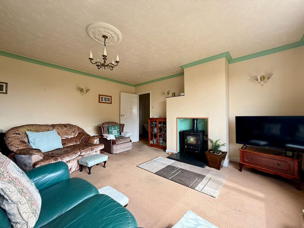 Window to rear overlooking the garden, with sea and coastal views towards the Llyn Peninsula, coved ceiling, ceiling rose, wall lights, open fireplace housing a wood burning stove, tiled hearth, 2 radiators, carpet.
