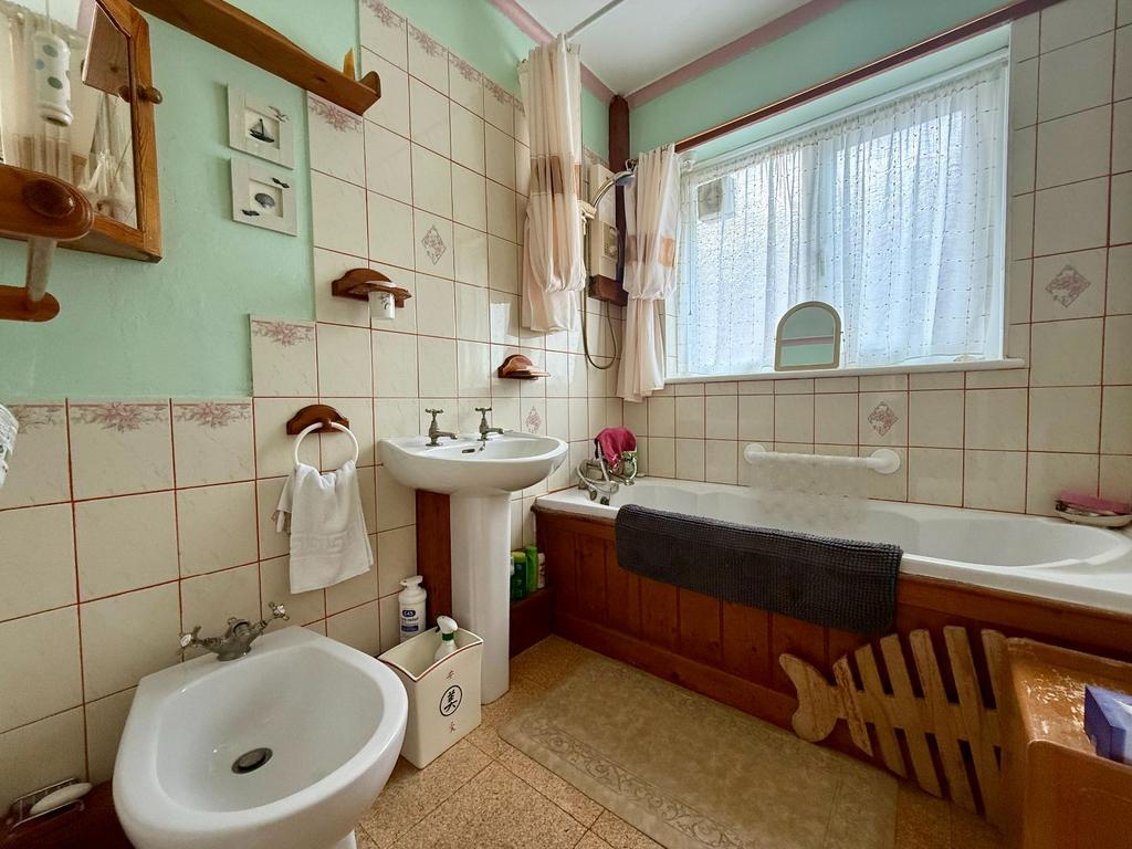 Window to side, panelled bath with mixer shower attachments, electric shower over, partly tiled walls, extractor fan, pedestal wash hand basin, bidet, radiator, cork tiled flooring.