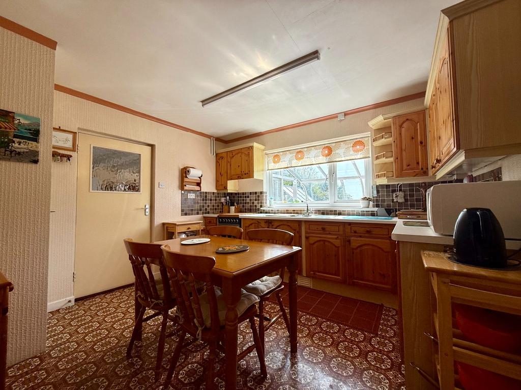 Window to rear into conservatory, with views over the garden and coastal views, coved ceiling, 7 wall units, 7 base units under a laminate worktop, integrated fridge, 1 1/4 stainless steel sink and drainer, space for cooker, tiled splash backs, pantry cupboard, radiator, cushion flooring.