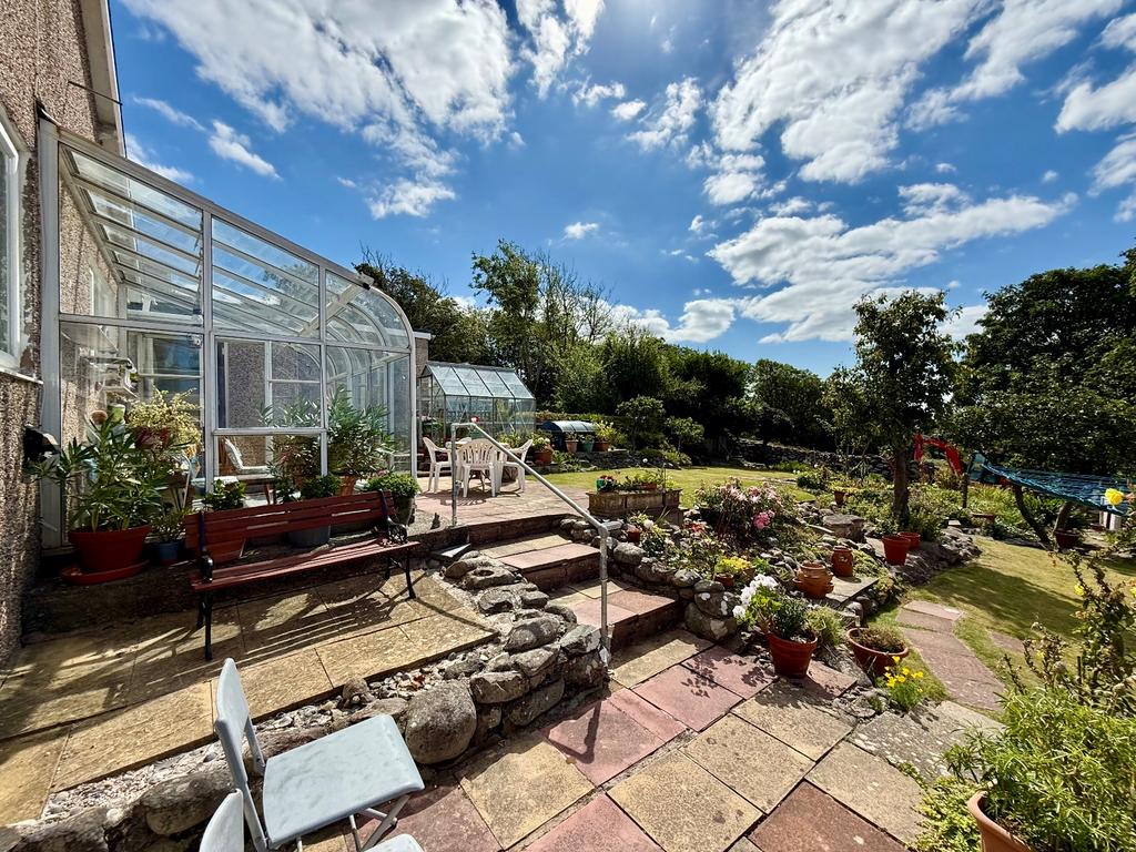 An aluminium conservatory opens onto a patio, offering breathtaking coastal and sea views. A raised section accommodates a greenhouse, with the oil storage tank situated just beyond.