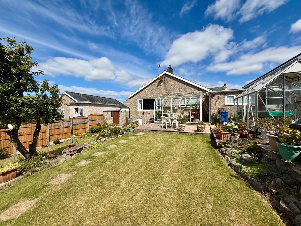 The rear features beautifully maintained gardens, predominantly laid to lawn, complemented by well-stocked borders and mature trees.