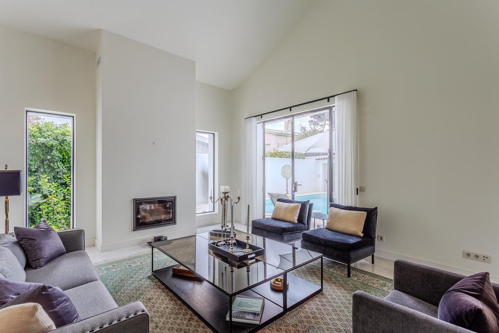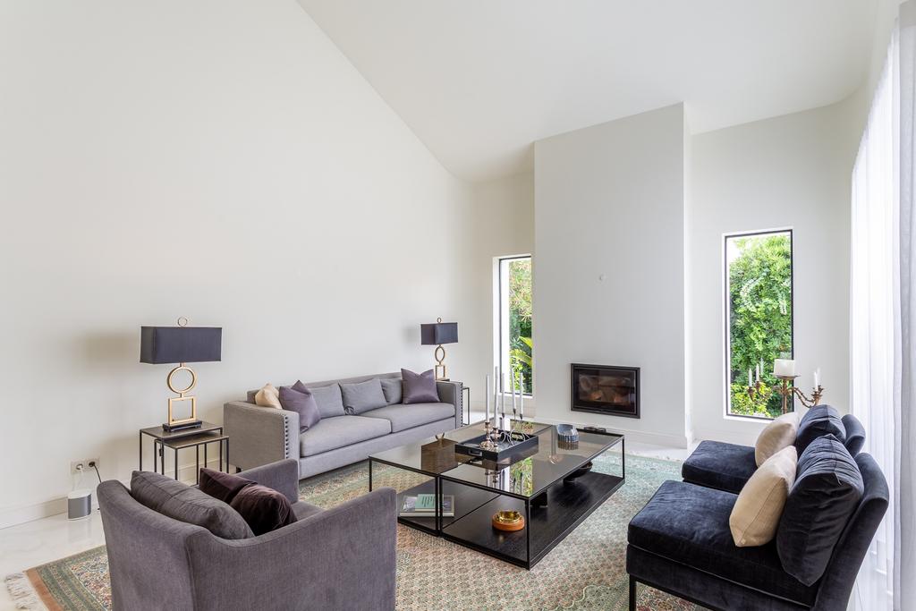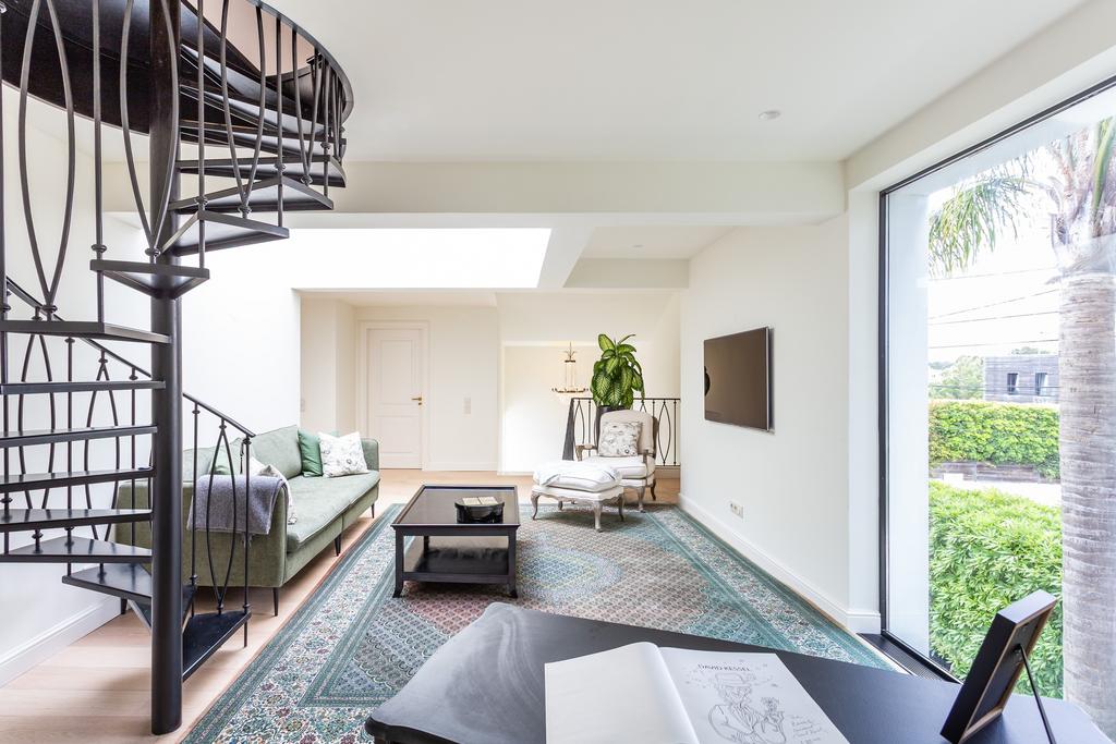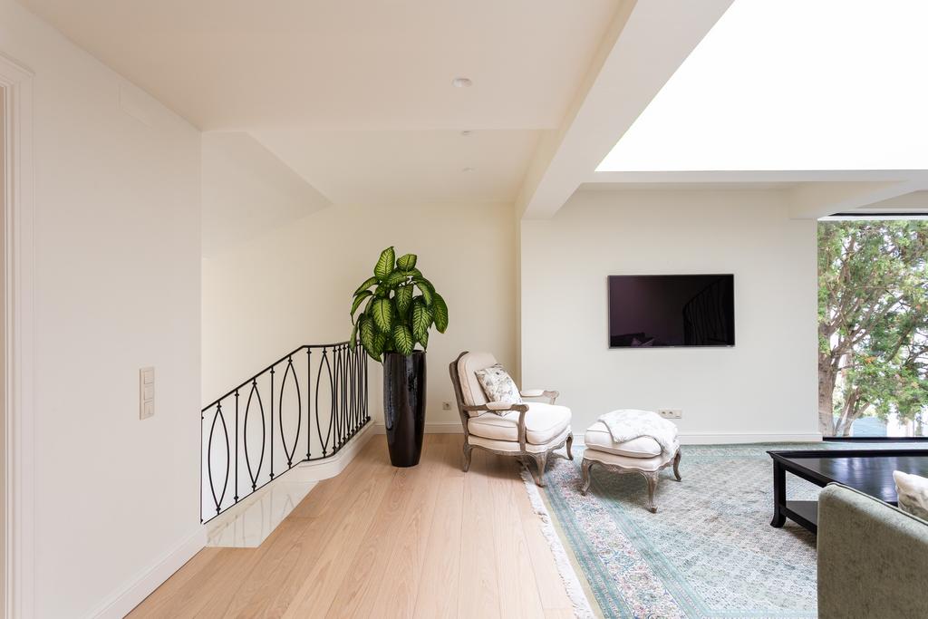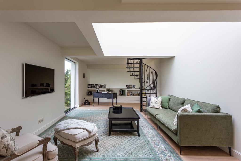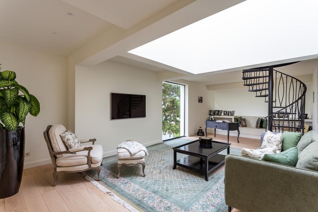 The ground floor features a large, open-concept living room, kitchen, and dining area that flows effortlessly together. The living room has a cosy fireplace, while the kitchen is a true centrepiece—very large, fully equipped with top-of-the-line Miele appliances, a wine cooler, custom-built cabinets, and a central island. The flooring on this level is marble from Estremoz, adding a sense of understated luxury. Handmade glass frames in iron add character and style to the space. This level also includes a social bathroom and a practical laundry room. A handcrafted spiral staircase with an iron railing leads to the upper floors.