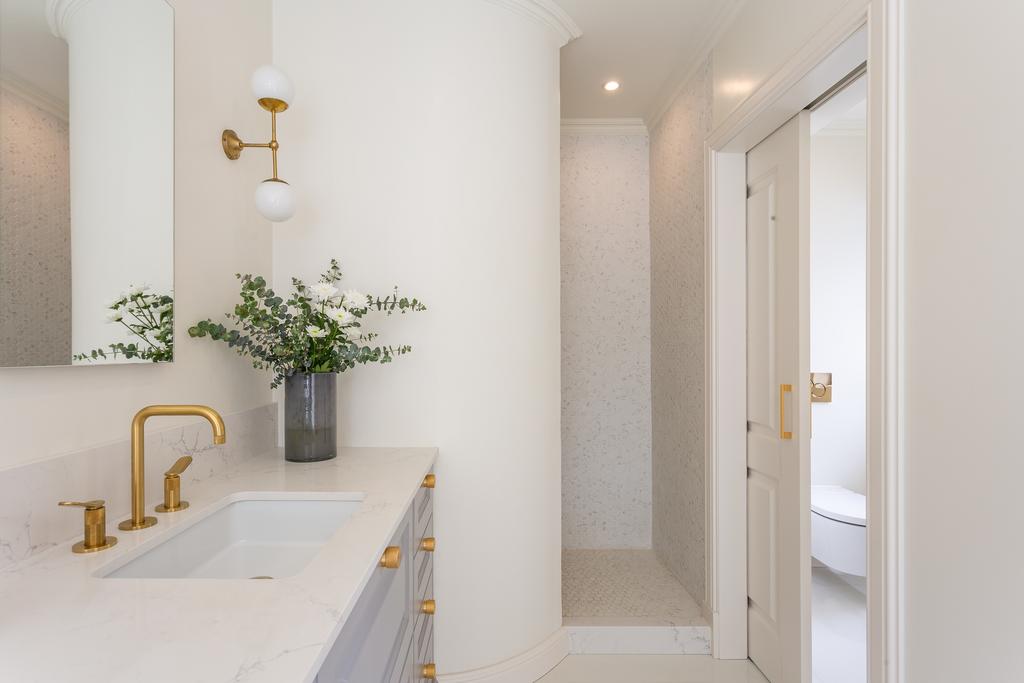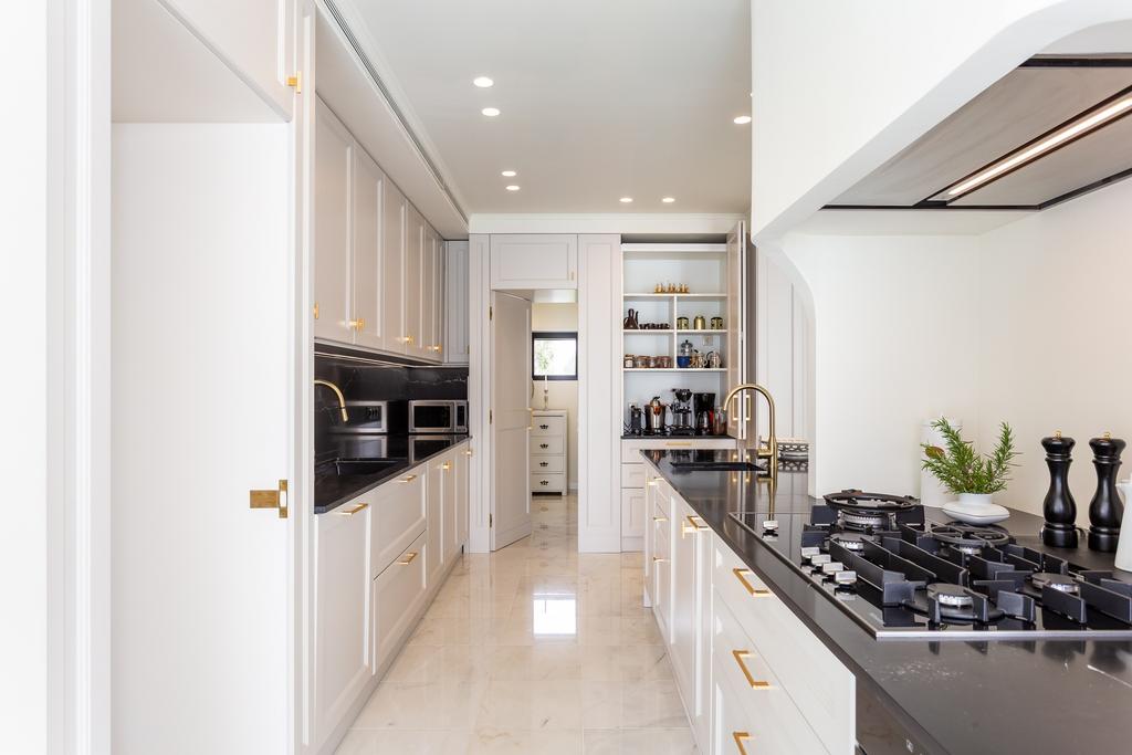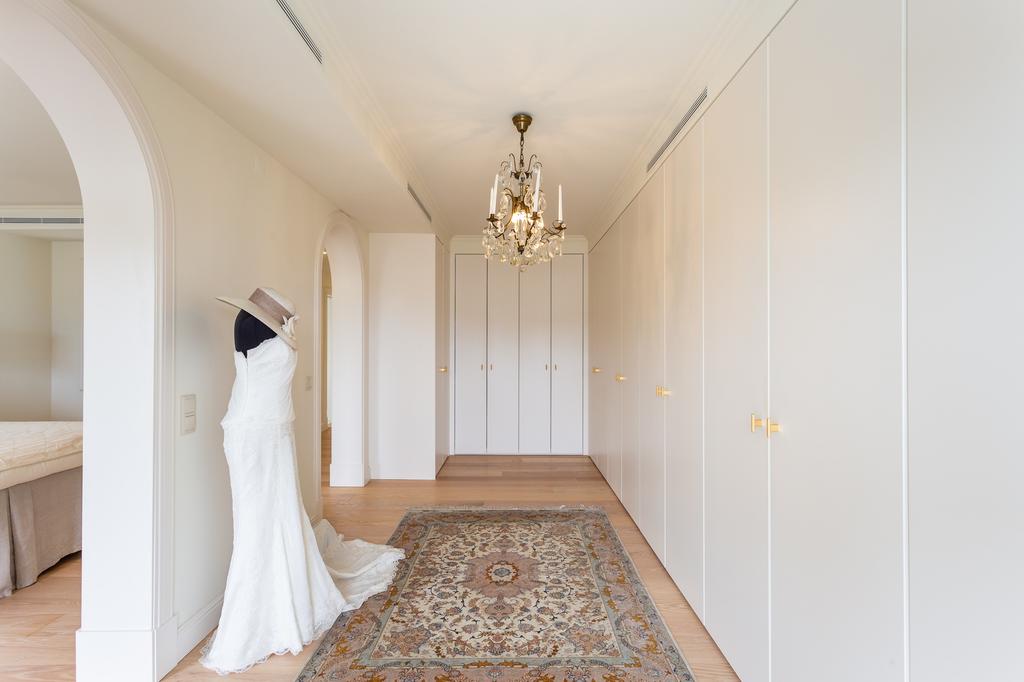 On the first floor, you’ll find two spacious ensuite bedrooms, each with its own balcony. The master bedroom with 56 sqm is particularly impressive, featuring a luxurious walk-in closet and an ensuite bathroom fitted with an exclusive bathroom cabinet, and brushed bronze fixtures and shower head by the Italian brand Cristina. A separate TV and social area adds versatility and comfort to this level.