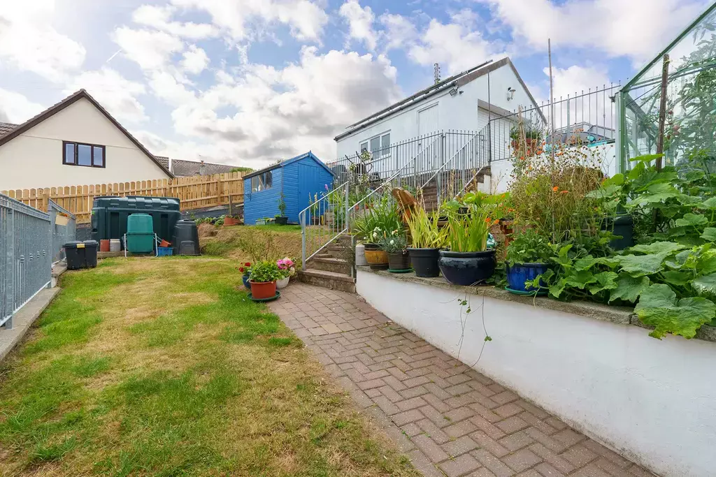 - Colourful tiered gardens with lawned areas, paved patio, range of shrubs and flowers, greenhouse and a storage shed