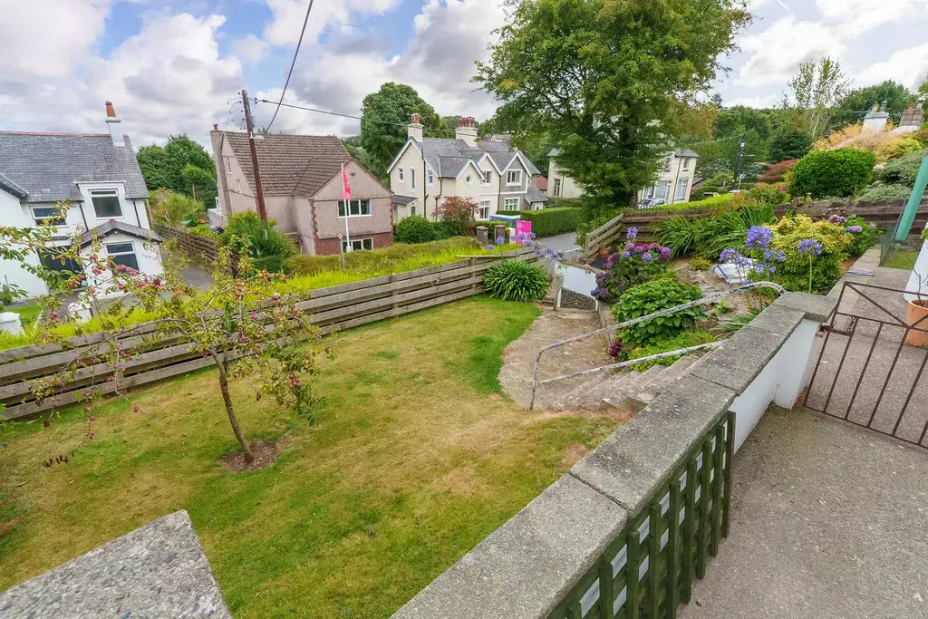 Externally, the property boasts colourful tiered gardens with lawned areas, paved patios, a variety of shrubs and flowers, greenhouse, and a storage shed. To the rear, accessed from The Crescent, there is a large detached garage and driveway, providing excellent parking and storage.
