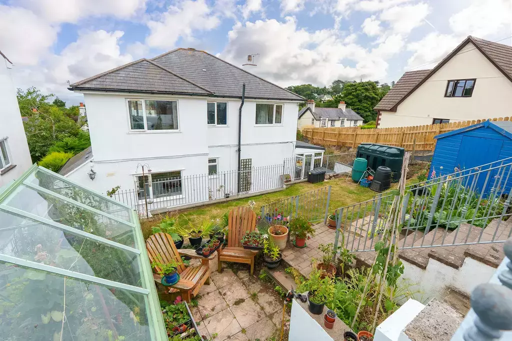 - Colourful tiered gardens with lawned areas, paved patio, range of shrubs and flowers, greenhouse and a storage shed
