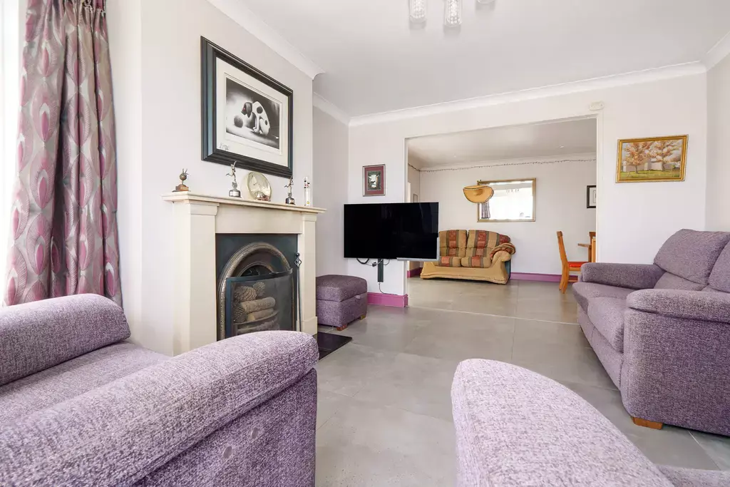 At the heart of the home is a stunning open plan dining kitchen, featuring a stylish fitted kitchen with central island. The dining area flows seamlessly into a welcoming living room with a curved bay window, creating a light and sociable living space. In addition, there is a separate sun room and a large utility room with a cloakroom (WC) off.