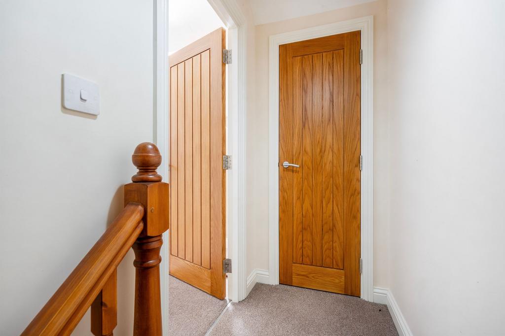 Moving up to the second floor, the master bedroom provides a peaceful setting with Velux windows that flood the space with natural light, built-in eaves storage to keep belongings tidy, and carpeted flooring for added comfort.