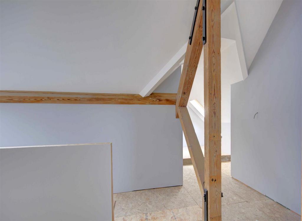 The Great Hall sits in the middle of the property joining the east and west wings. Three large windows overlook and provide access to the courtyard. The hall has Caithness flagstones on the floor, all of which are reclaimed from the old steading and still have the markings from machinery used, the original beams are exposed and supporting pillars are in situ. as well as a modern log burner and bespoke log store with bench. The high ceilings and open room will look amazing with the right furniture. A stairwell with double height ceiling leads to a large mezzanine area which overlooks the great hall and has been designed with a library in mind, exposed beams and strutts make for an interesting feature.