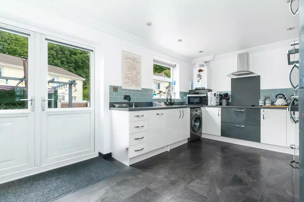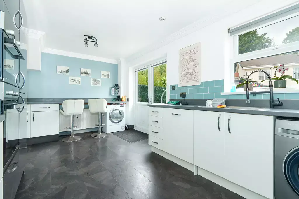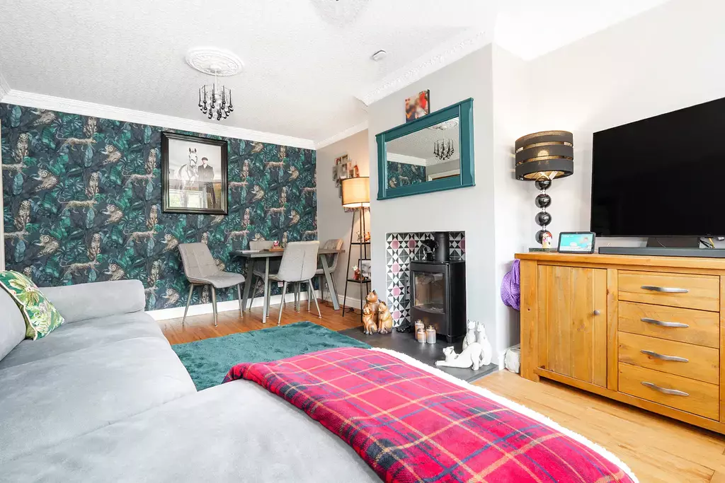 The deceptively spacious accommodation includes an entrance porch and welcoming hallway with cloakroom (WC), a cosy living room with attractive freestanding log burner, and a separate dining kitchen complete with breakfast bar seating – ideal for both everyday family life and entertaining.