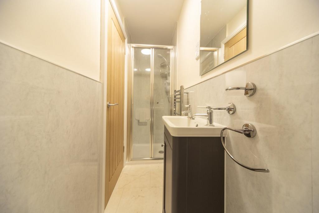 2.88m x .78m (9' 5" x 2' 7") With three piece suite comprising shower cubicle, WC and wash basin with storage as well as wall mirror, extractor fan, chrome finish towel radiator and tiled floor.