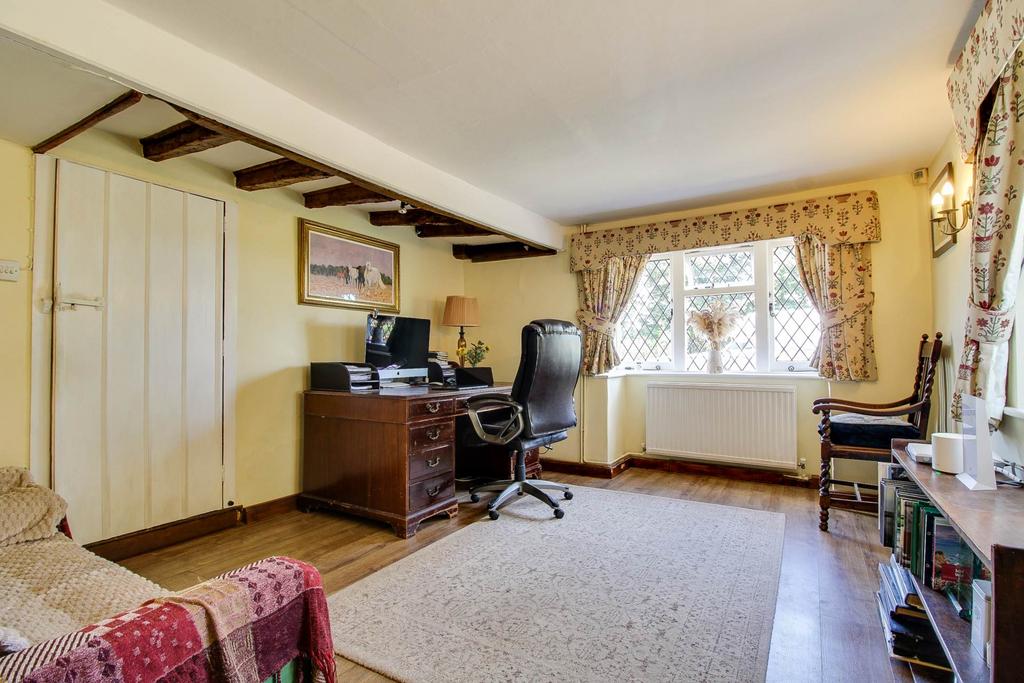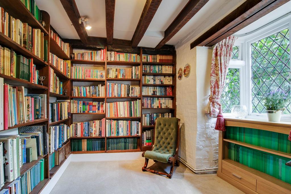 9'6 x 8'6. A secluded and peaceful retreat at the heart of the home, perfect for reading or quiet reflection. South-facing bay window draws in natural light, complemented by fitted bookshelves and characterful oak beams.
