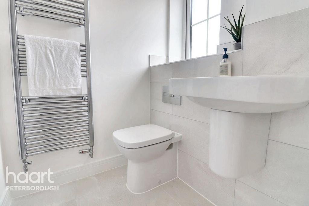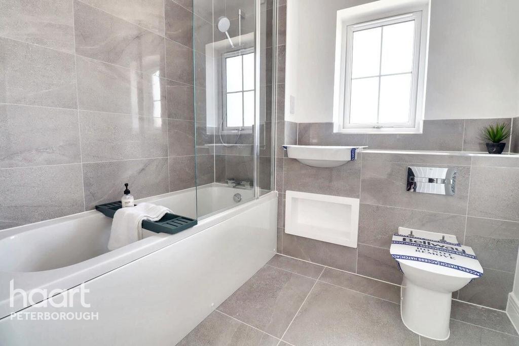 A high-spec and modern main bathroom. Features include a bath/shower combo, toilet, sink, and heated towel rail.