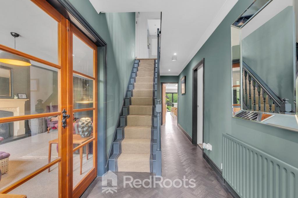 Upon entering the property, you're welcomed into a spacious and traditional hallway featuring a stair runner leading to the first floor with a anthracite matt banister, decorative coving, LED spotlights, and elegant Amtico herringbone flooring. All ground floor rooms are accessible from the hallway, which also includes understairs storage cupboards.