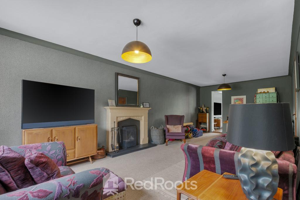 Accessed through glazed double doors from the hallway or via a connecting snug alcove from the kitchen, this formal lounge is a bright, inviting space. A four-panel bay window overlooks the front of the property, while a functional open fire adds character and warmth. Decorative coving enhances the traditional charm, and the generous space currently accommodates both a lounge and home office area.