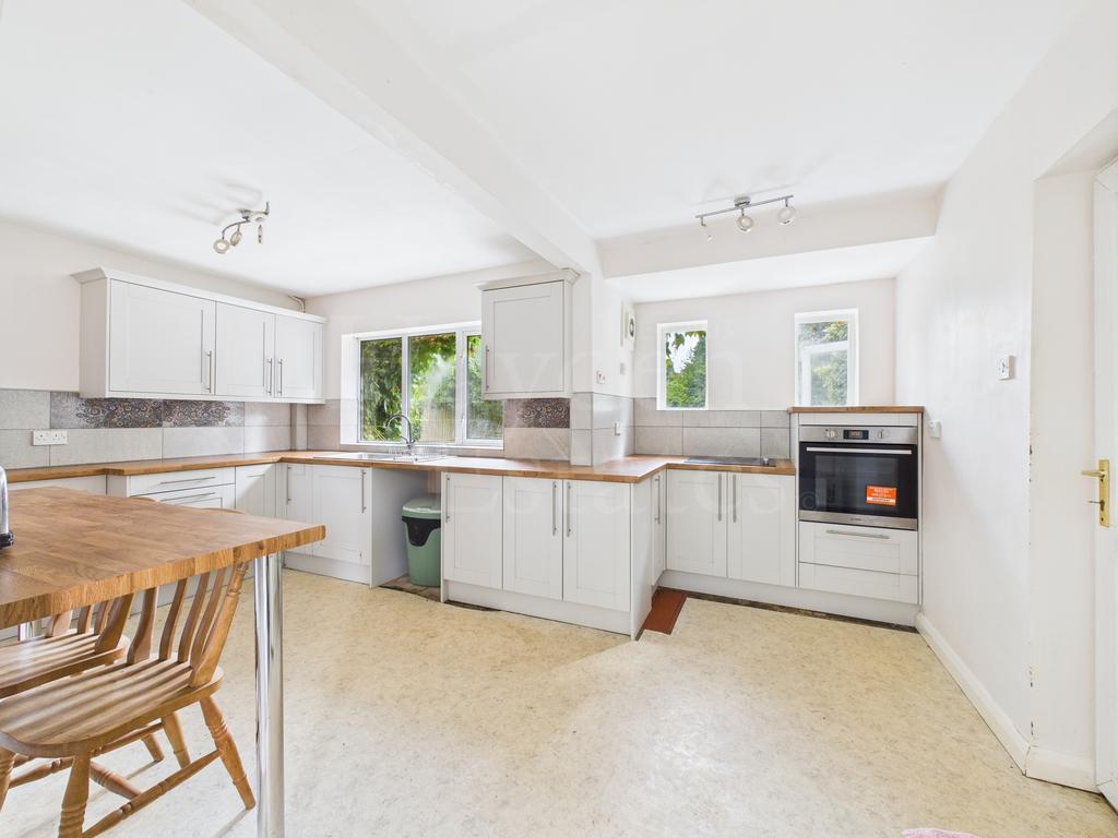 Door the the garage, wall extraction fan, three windows to the rear elevation. Three ceiling light points, vinyl flooring. Having a range of units to both wall and base with the latter having complimentary working surface over. Partial tiling to the walls provides splash back. Inset sink unit with mixer tap over, breakfast bar, inset four ring electric hob unit with electric oven also. Space and plumbing for white goods. Breakfast bar.