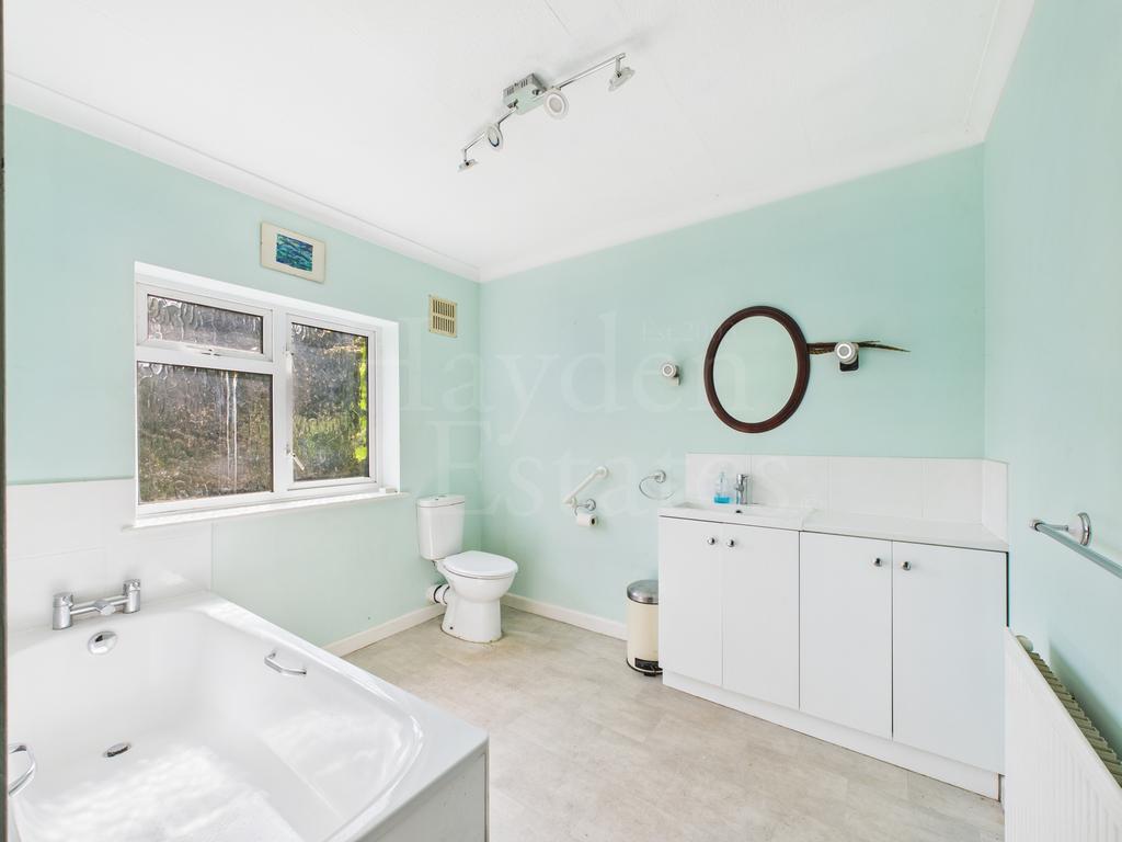 Having rear facing window, coving to the ceiling, two wall light points, ceiling light point, radiator with TRV. Vanity style sink unit with mixer tap over, close coupled wc suite, panelled bath with mixer tap and partial tiling to the walls providing splash back.
