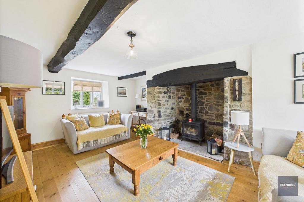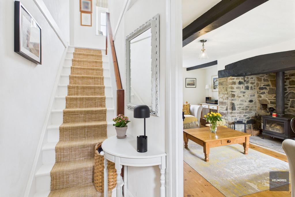 The kitchen/diner has a lovely array of light shaker style units with a feature central island. The worktops are solid wood with a Belfast sink, there’s space for a fridge/freezer and dishwasher and a stable door leads from this area out to the garden, a pantry cupboard to the side provides great extra storage. The dining space has lovely inset shelves and plenty of space for a dining table. The lounge is full of light from windows front and back, there is a solid wood floor and a stone inglenook fireplace with multi-fuel woodburning stove, perfect for cosy winter evenings.