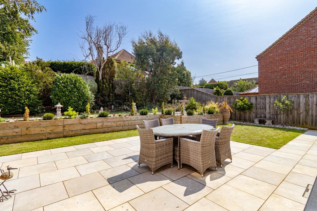 The property is approached through a pair of wrought iron gates that open onto an expansive shingled driveway, offering ample parking and turning space for multiple vehicles. To the rear, the current owners have recently landscaped the garden to create a beautiful, well-considered space ideal for entertaining and relaxation. The garden is arranged over two levels: the lower level features a well-maintained lawn and a spacious patio, perfect for al fresco dining and summer gatherings. Attractive timber sleeper planters define the space between the levels and are filled with colourful, seasonal planting. The upper level is laid mainly with decorative pebbles, with the rear boarder featuring mature shrubs and planting that add texture and interest year-round. A large garden shed, equipped with power provides excellent storage or potential for a workshop.