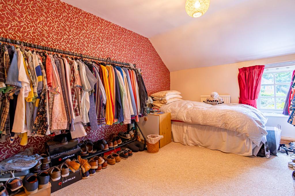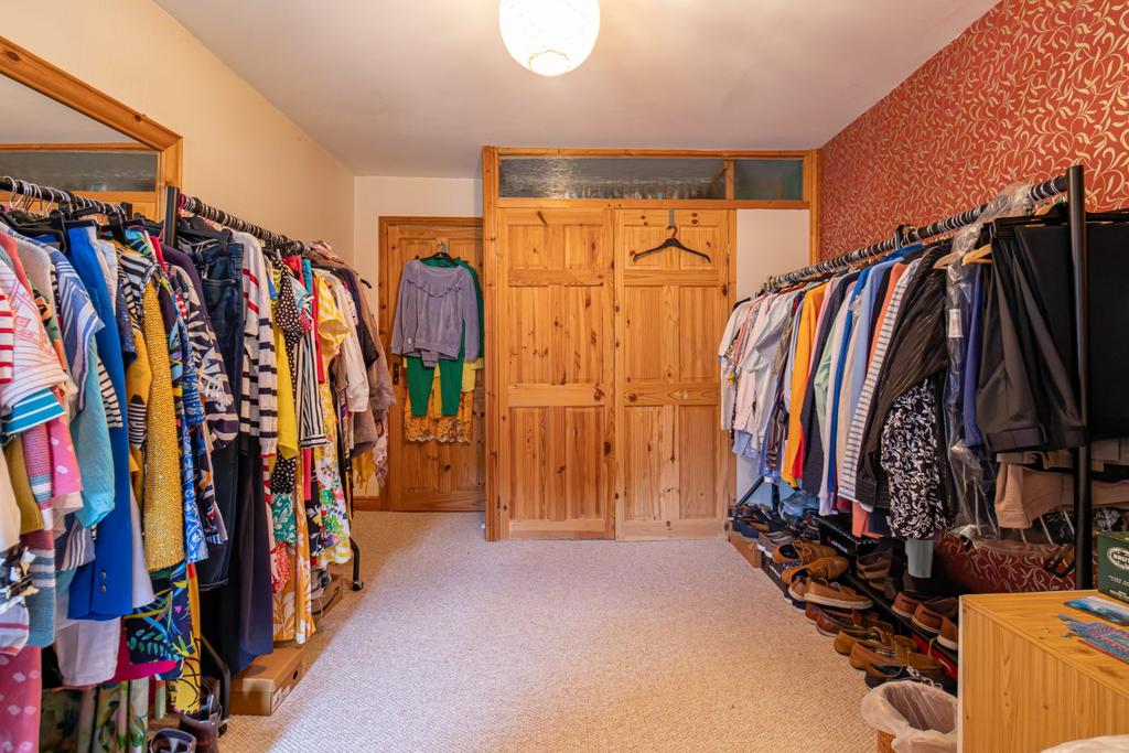 A door from the kitchen leads into the utility room, which offers a further range of storage units and houses the washing machine and gas-fired central heating boiler. The utility room leads through to another highly adaptable ground floor reception space, listed as the play room, which has an independent side entrance door and has been used as a fifth bedroom or could be adapted to create a self-contained annexe.