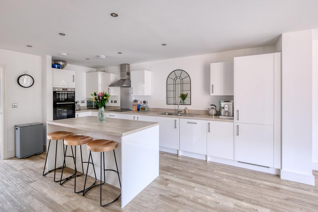 Entering the property, a large hallway provides access to the downstairs WC, lounge, and kitchen/diner/family room. The lounge is light and bright with dual aspect windows, with neutral décor creating an inviting atmosphere that sets the tone for the rest of the home. The kitchen features a range of base and eye-level units, an island that doubles as a breakfast bar fit with three stools offering informal dining. Built-in appliances include fridge freezer, dishwasher ,and washing machine. The dining space in the home is a great place for family meals or hosting, accommodating a dining table for eight with French doors to the garden.