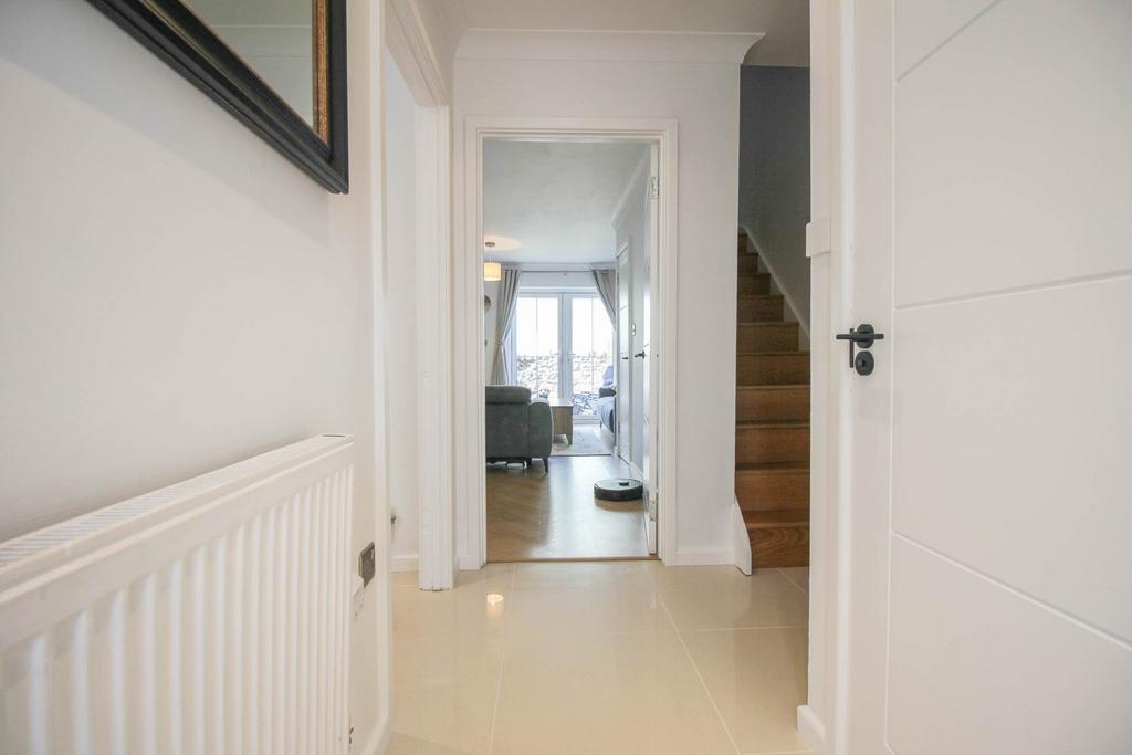 Via composite front door. Smooth coved ceiling with inset spot lighting, porcelain floor. Radiator. Oak clad staircase rising to first floor.
