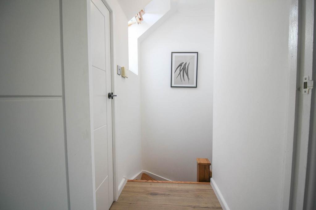 Smooth coved ceiling with central light. Storage cupboard. wood effect floor. Stairs rising to second floor.