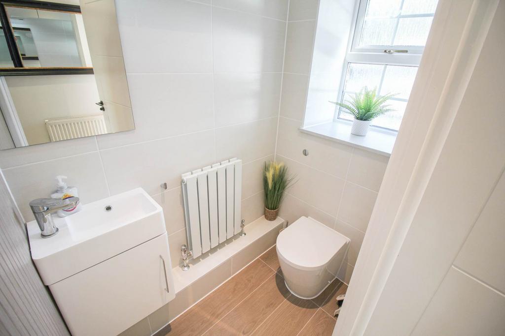 Front aspect obscured uPVC double glazed window. smooth coved ceiling with inset spot lighting Comprising concealed WC and vanity wash hand basin with mixer tap. Fully tiled walls and floor, radiator