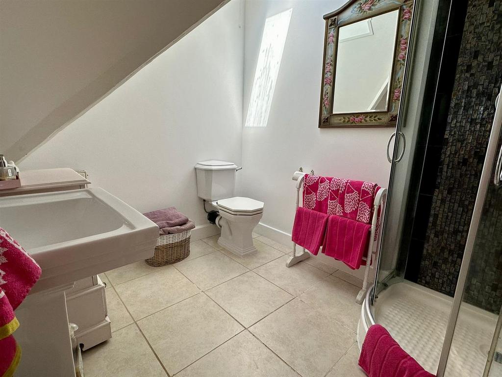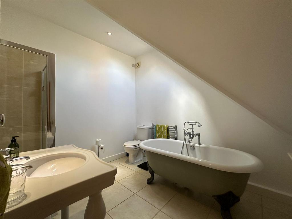 Bathroom - With free-standing roll-top clawfoot bath, large shower cubicle, wash hand-basin, low flush WC, tiled floor, Velux-style rooflight and radiator.