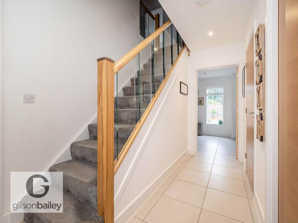 Tiled flooring, window and door to the front, stairs with glass banister leading to the first floor landing.