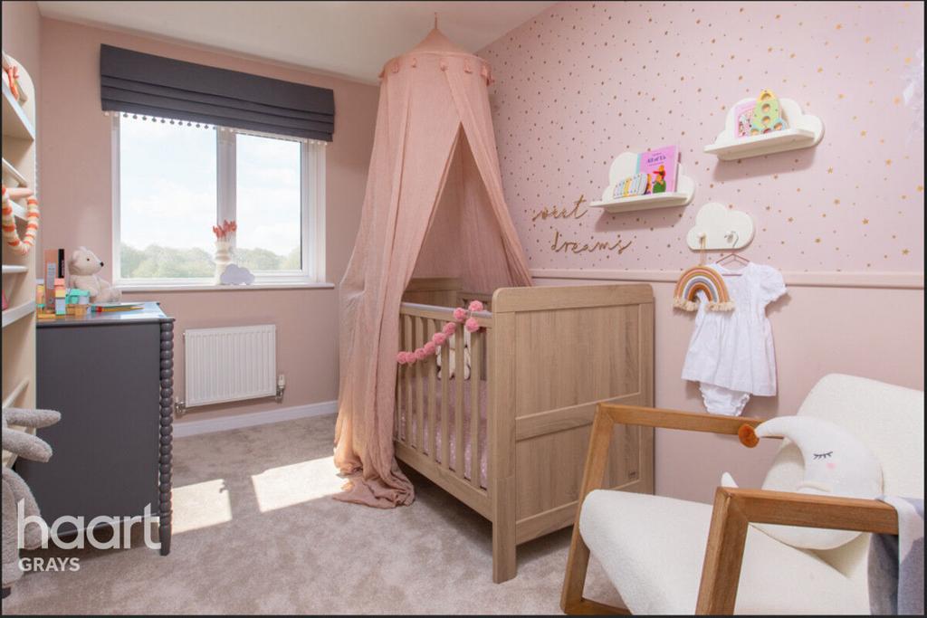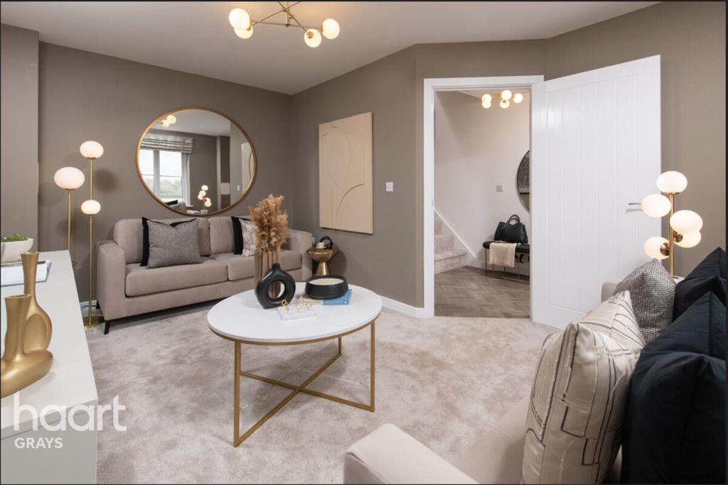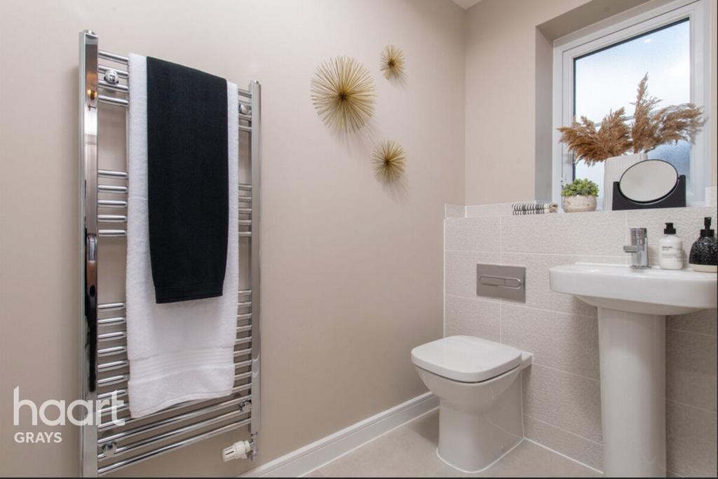 Upstairs, the main bedroom benefits from its own en suite, with two further bedrooms served by a modern family bathroom fitted with Roca sanitary ware and wall tiles. Outside, there is private parking with EV charging points, and most homes benefit from solar panels for lower energy bills. Designed with efficiency in mind, The Harper is set within a community with landscaped green spaces, a children’s play area, and excellent transport links including fast trains to London and easy access to the A13, A127, and M25. A 10-year warranty and insurance protection provide peace of mind.