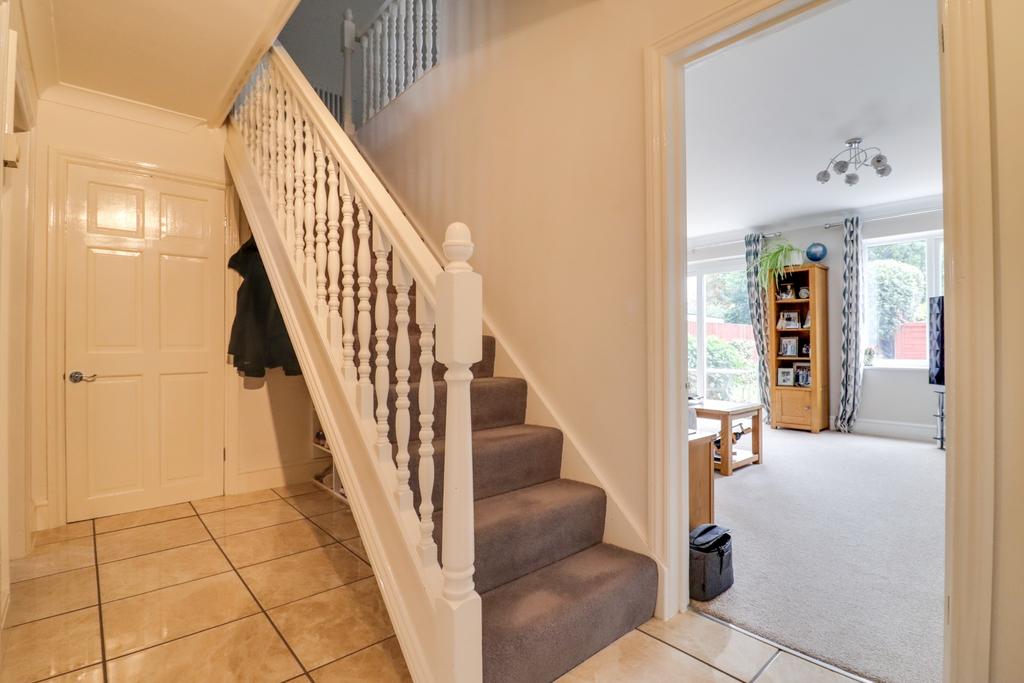Smooth finish to coved ceiling, double glazed door to side elevation, stairs rising to first floor, radiator, tiled floor, doors to: