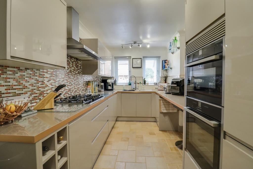 Smooth finish to coved ceiling, double glazed windows to front elevation, range of modern wall base and drawer units with roll top work surface over, sink and drainer inset, integrated double oven and hob with extractor fan over, integrated fridge freezer, tiled splashbacks and flooring, radiator.