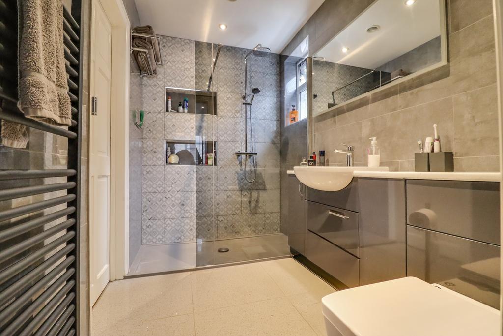 Smooth finish to ceiling with inset spotlights, double glazed window to side elevation, low level WC and vanity wash hand basin, walk in shower, heated towel rail, tiled floor to ceiling.