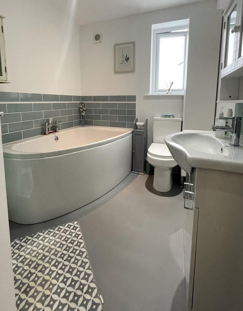 Obscure glazed window to rear. The bathroom is fitted with a white suite, comprising; WC, vanity style wash hand basin with chrome mixer tap and cupboards beneath. Corner shower cubicle with sliding curved doors. Corner bath with chrome mixer tap. Chrome ladder style towel rail.