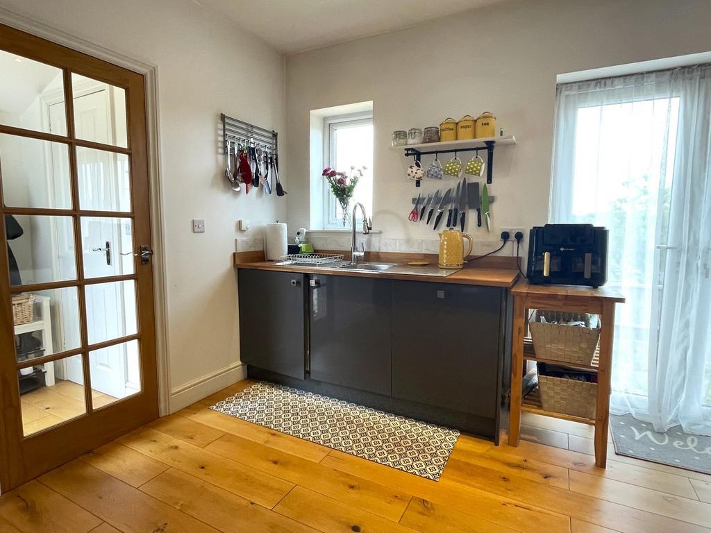 On the other side of the kitchen, there is an L shaped run of work surface, with inset four ring gas hob with extraction over and built in oven beneath. Full height unit incorporating built in fridge freezer. The L shaped run of workface forms a useful breakfast bar.