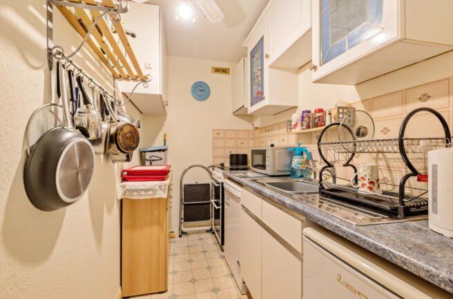 KITCHEN – 2.74m x 1.47m (9'0" x 4'10") A well appointed kitchen with a range of wall and base units with roll edge worktops above, stainless steel sink with drainer, cooker, fridge, freezer, and dishwasher. Additional features include cupboard lighting, a wall mounted water heater and part tiled walls.