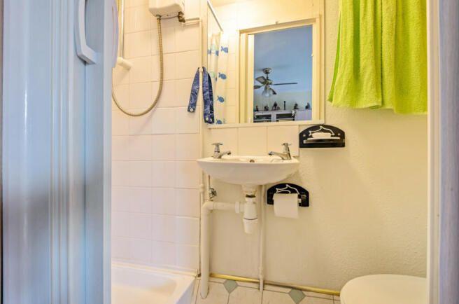 SHOWER ROOM A three piece suite comprising a low level WC, wash hand basin and a walk in shower cubicle with overhead electric shower, extractor fan and part tiled walls.