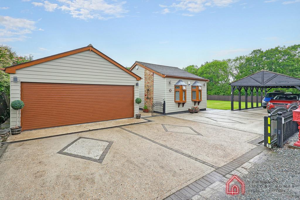 The property boasts a variety of impressive outbuildings. Among these, you'll find a spacious 17'9" x 17'9" log cabin, currently transformed into a vibrant games room and bar, and a substantial detached double garage (17'10" x 17'7") that currently serves the owner's catering business.