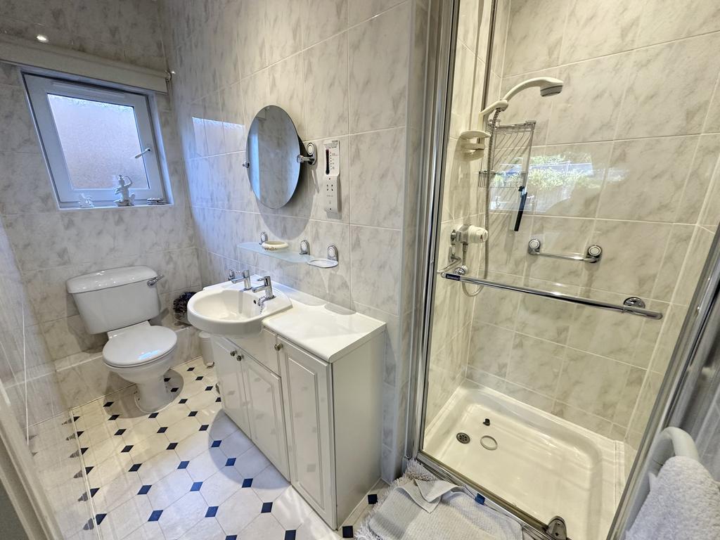 UPVC double glazed window to side aspect, sink with vanity storage, low flush wc, walk in shower cubicle and towel radiator.