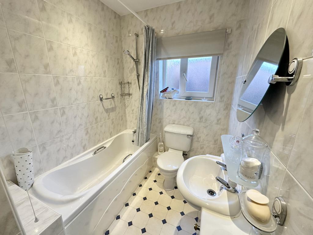 UPVC double glazed window to side aspect, fitted three piece bathroom suite panelled bath with overhead shower, vanity wash hand basin, low flush w.c, tiled walls and radiator.
