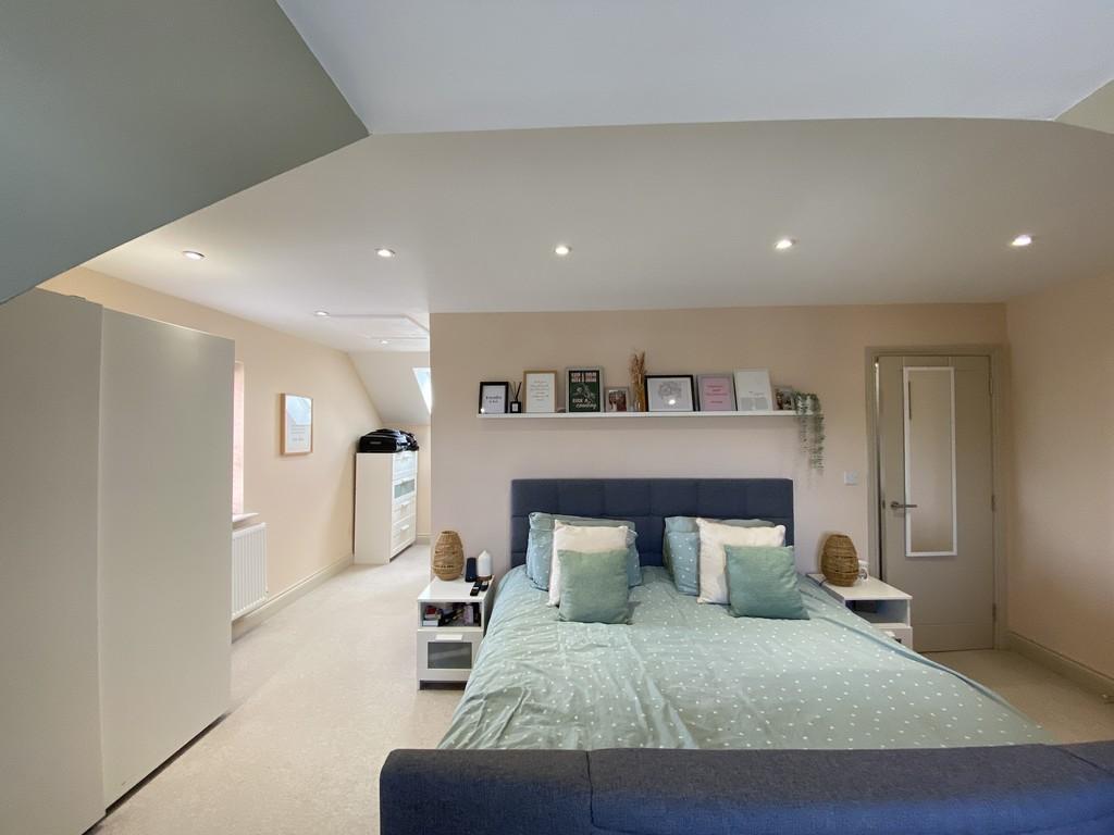 MAIN BEDROOM 18' 8" x 17' 8" (5.7m x 5.4m) A spacious and well-appointed main bedroom, enhanced by neutral décor and soft carpeting. Twin windows, including a dormer, ensure excellent natural light, while recessed spotlights add a modern finish. The room offers ample space for wardrobes and storage, making it an inviting retreat.