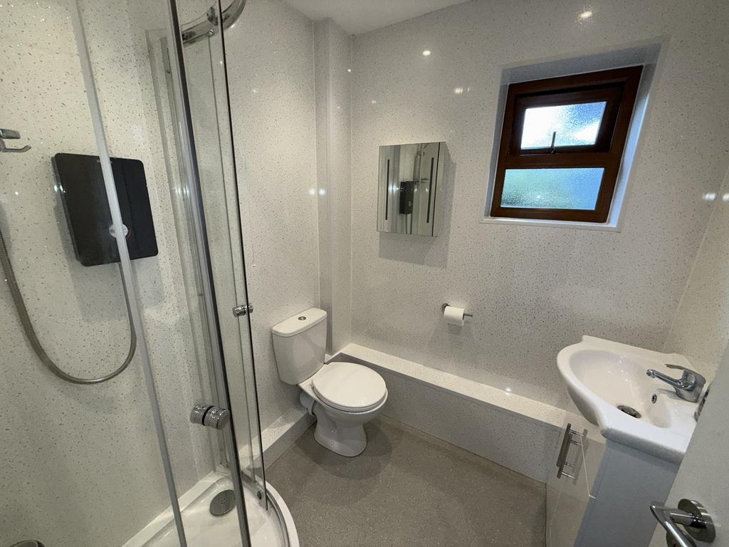 Corner shower cubical with ‘Bristan’ electric shower, low level flush WC, vanity wash and basin, double glazed window to side, integral spotlighting, extractor fan, chrome effect heated towel rail and fully shower boarded walls.