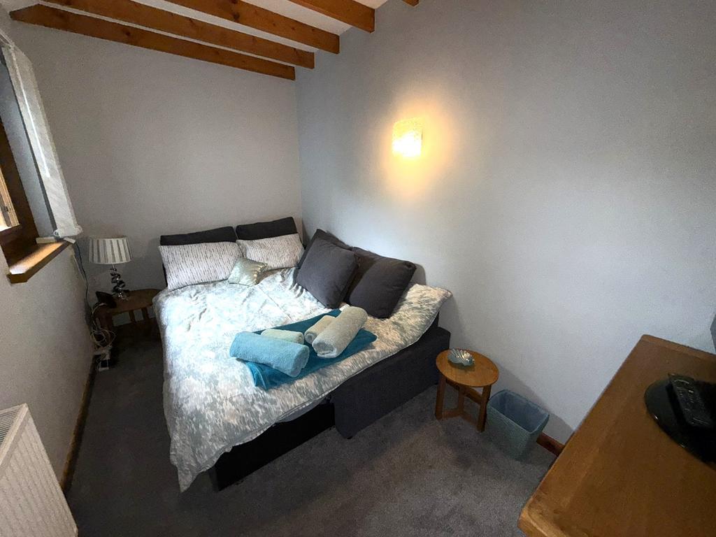 Double glazed window to rear, vaulted open beamed ceiling, modern wall mounted upright radiator and built in wardrobe.