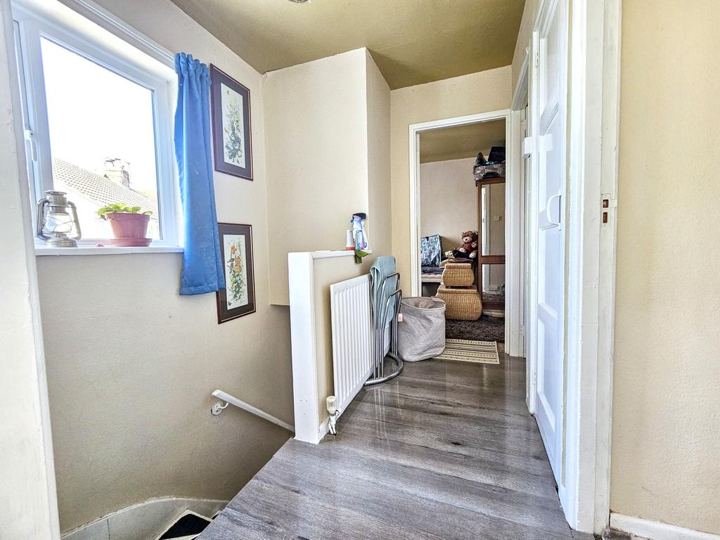 FIRST FLOOR LANDING With laminate wood flooring, ceiling hatch to roof space, and window.