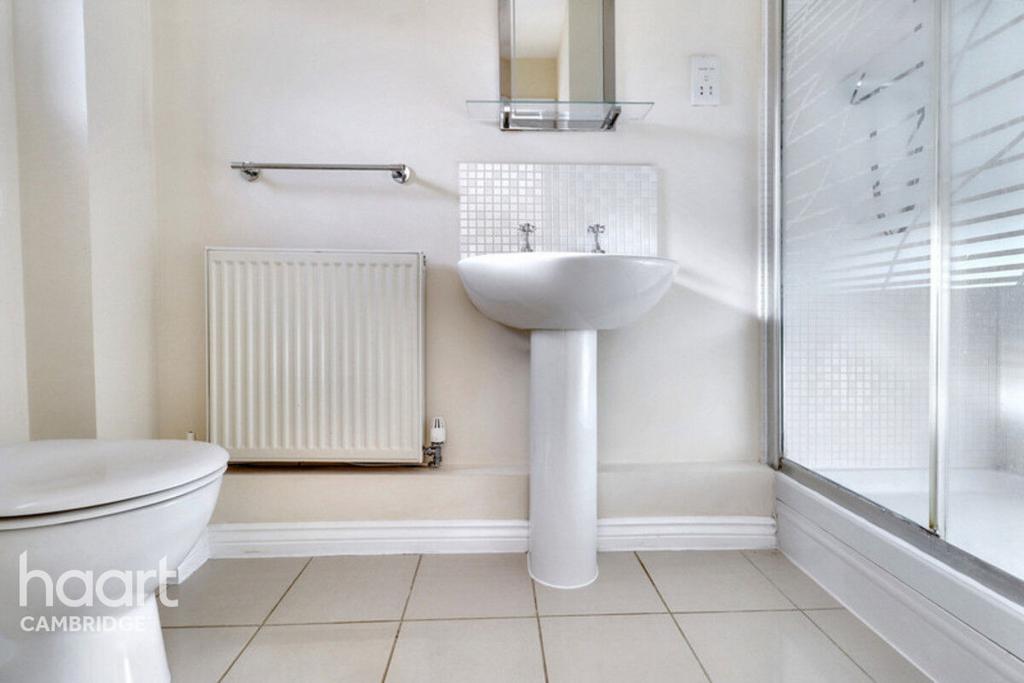 A convenient and well-maintained en-suite bathroom, complete with a modern three-piece suite, including a WC, pedestal sink and a corner shower with a mixer tap. Additional features include a double radiator, obscured double-glazed windows and tiled flooring.
