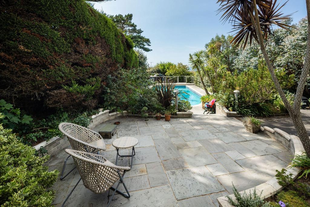 Terraced gardens and patios to the rear. The garden stretches up to the rear with flat lawn areas and a concrete base designed for a hot tub. To the front are further gardens and a heated swimming pool. Amazing views from all angles, especially the top of the garden.